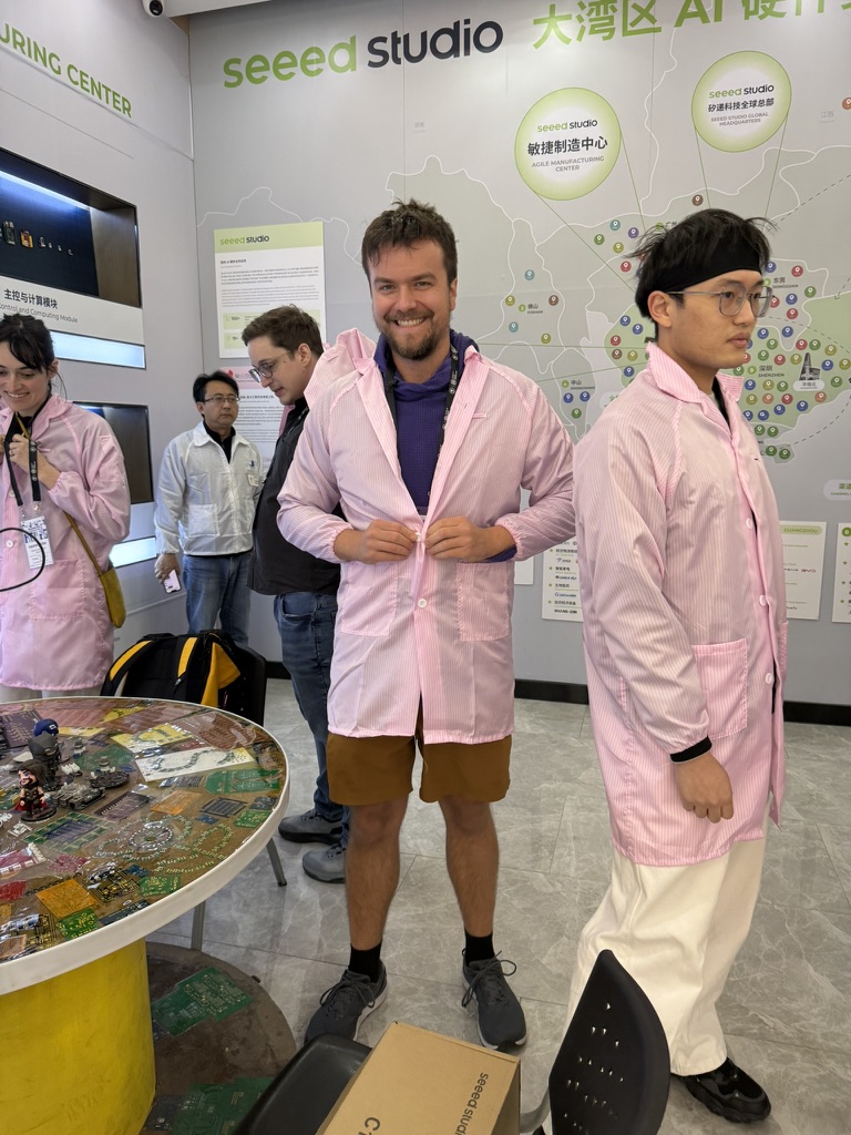 Our final stop was the Seeed Studio factory & warehouse, a company I have gladly ordered from before. This warehouse is where they assemble, test, and ship a huge range of products. They even had a wind tunnel for calibrating weather sensors! I found Seeed’s warehouse to be much closer to what I would expect to see in the States: everyone in a uniform, caution tape around doors that swing open, masks and ventilation, and a considerable number of windows open to let the cool breeze in.